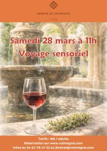 Dégustation immersive à l’Abbaye de Valmagne Cet atelier autour du vin vous invite à explorer la dégustation autrement, à travers un véritable voyage sensoriel reliant nature, patrimoine et savoir-faire viticole. Guidés pas à pas, vous découvrirez nos cuvées en mobilisant vos sens : la vue, l’odorat, le toucher et bien sûr le goût. Pour enrichir cette expérience, des herbes aromatiques fraîches issues de notre jardin - romarin, thym et autres plantes du domaine - seront proposées à sentir et manipuler…