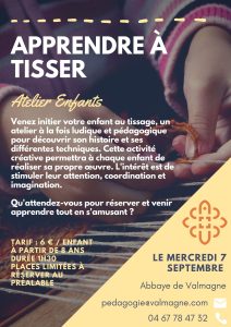 Le tissage est une technique permettant d'obtenir un tissu textile constitué de fils entrelacés. Venez initier votre enfant au tissage, un atelier à la fois ludique et pédagogique, pour découvrir son histoire et ses techniques. Cette activité créative permettra à chaque enfant de réaliser sa propre œuvre. Le mercredi 7 septembre 2022 à 15h au sein de l'Abbaye de Valmagne. * Tarif : 6 € / enfant * À partir de 8 ans * Durée 1h30 * Places limitées à…