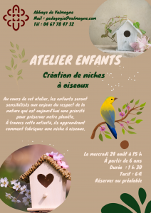 Une niche est particulière à chaque espèces d'oiseaux. Durant cet atelier les enfants pourront découvrir la biodiversité de l'Abbaye de Valmagne ainsi que les techniques pour la protéger ou lui permettre de se développer. Chaque enfant va pouvoir créer une niche et la décorer selon sa créativité. Tout le matériel nécessaire sera fourni. Le mercredi 24 août à 15 h, au sein de l'Abbaye de Valmagne * Tarif : 6 € / enfant * À partir de 6 ans *…