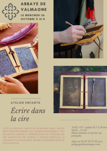 C’est au cœur de l’Abbaye de Valmagne, dans l’ancien réfectoire des moines, que Clémence proposera à vos enfants de s’initier à l’apprentissage de l’écriture sur une tablette de cire. Les tablettes sont des petites planches de bois légèrement creusées et recouvertes de cire sombre. Comme à l’époque médiévale, le partage et la découverte, seront les maîtres mots de cette activité. Cet évènement se déroulera le 26 octobre à 15h. Tout le matériel nécessaire sera fourni durant l’atelier. * Tarif : 6…