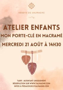 Mercredi 21 Août à 14h30, permettez à votre enfant de créer, tisser, imaginer son futur porte-clé en macramé ! Un atelier original et ludique animé par notre Responsable pédagogique pour égayer votre trousseau de clé. Tarif : 6€/enfant uniquement Réservation sur notre site internet uniquement Informations à pedagogie@valmagne.com ou au 04-67-78-47-32