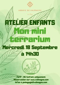 Rien de plus satisfaisant pour votre enfant de voir sa création vivre et grandir grâce à ses propres mains ! Mercredi 18 Septembre à 14h30, donnez l’occasion à vos enfants d’avoir la main verte tout en s’amusant ! Tarif : 6€/enfant uniquement Réservation sur notre site internet uniquement Informations à pedagogie@valmagne.com ou au 04-67-78-47-32