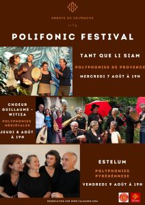 Programme complet L'Abbaye de Valmagne vous ouvre ses portes pour la 2ème édition du Polifonic Festival ! Au programme : Polyphonies de Provence - Mercredi 7 Août à 19h : TANT QUE SI LIAM Tant que li Siam ce sont trois voix nomades, enfants de Méditerranée, qui se rencontrent au pied d'un mont, le Ventoux. De leurs pérégrinations sur les flancs du Géant de Provence, naît un répertoire de chants polyphoniques, composé à partir de poèmes populaires de langue…