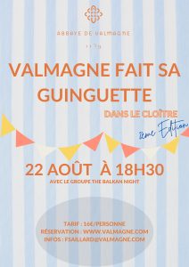 La soirée "Guinguette" dans le cloître fait son grand retour pour sa 2ème édition, le Jeudi 22 Août 2024 à partir de 18h30. Une superbe ambiance musicale vous attend avec le groupe The Balkan Night : rythme, énergie, variété, improvisations puissantes du violon et de la clarinette... une recette festive ! Vous pourrez également profiter de foodtrucks locaux et de qualité sur place et du bon vin de l'abbaye bien-sûr ! * Entrée à 16€ / adulte (verre de l'abbaye…