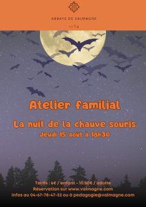 Plongez au cœur de la nuit et découvrez les fascinants habitants ailés de notre abbaye historique ! Participez à une soirée exceptionnelle dédiée aux chauves-souris, créatures mystérieuses et souvent méconnues. Tarifs : 6€ / enfants - 10.50€ / adulte Réservation sur www.valmagne.com Infos au 04-67-78-47-32 ou à pedagogie@valmagne.com